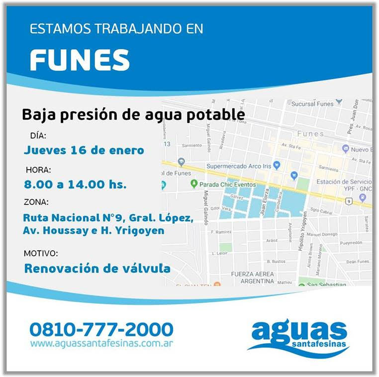Por este motivo, mañana jueves 16 de enero desde las 8:00 hasta las 14:00 horas, se registrará baja presión en el suministro de agua potable en la zona delimitada por Ruta Nacional N°9, Gral. López, avenida Houssay e Hipólito Yrigoyen.
