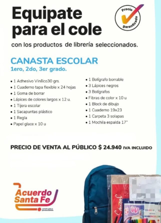 La propuesta provincial se enmarca bajo el programa “Acuerdo Santa Fe” que promueve el gobierno y que se dio a conocer la semana pasada con un listado de supermercados que cuentan con más de 140 artículos a precio de enero durante todo este mes. Esta vez le tocó a la canasta escolar con 20 artículos (entre ellos mochila), a precios menores que los convencionales.