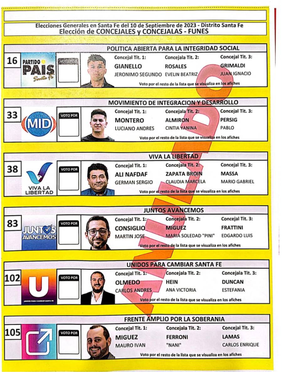Por otro lado, la amarilla, para elegir concejal, está integrada por Jerónimo Gianello, de Partido País; Luciano Montero, de Movimiento de Integración y Desarrollo (MID), Germán Ali Nafdaf, de Viva la Libertad; Martín Consiglio, de Juntos Avancemos; Carlos Olmedo, de Unidos para Cambiar Santa Fe; y Mauro Miguez, de Frente Amplio por la Soberanía.