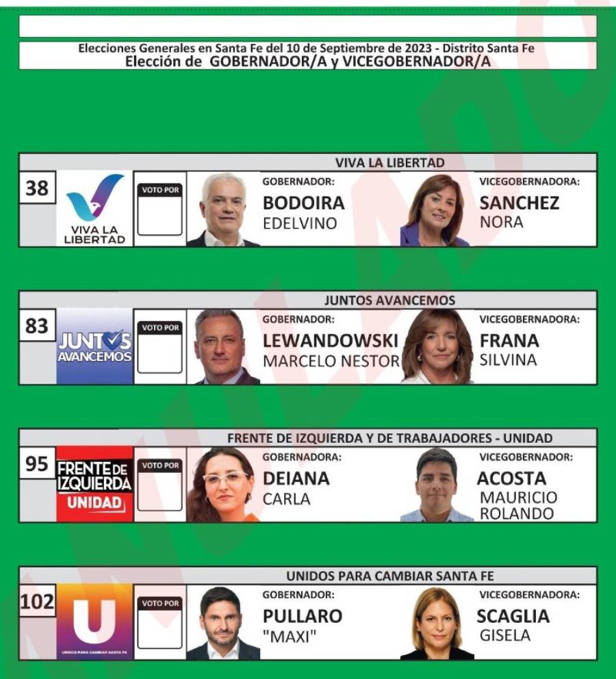 En tanto, la lista verde es la que tiene en su interior los candidatos a gobernador y vice. En ella se encuentran para dirigir la provincia los nombres de Edelvino Bodoira, Marcelo Néstor Lewandowsky, Carla Deiana y “Maxi” Pullaro, en ese orden y con esa denominación.
