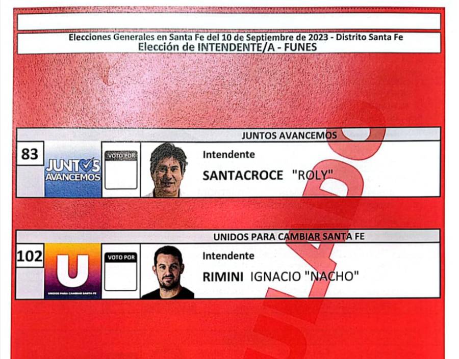 A nivel local, la lista roja es la que tiene a los dos únicos candidatos a intendente: nacho Rímini, por Unidos para Cambiar Santa Fe, y Roly Santacroce, por Juntos Avancemos, por la reelección.