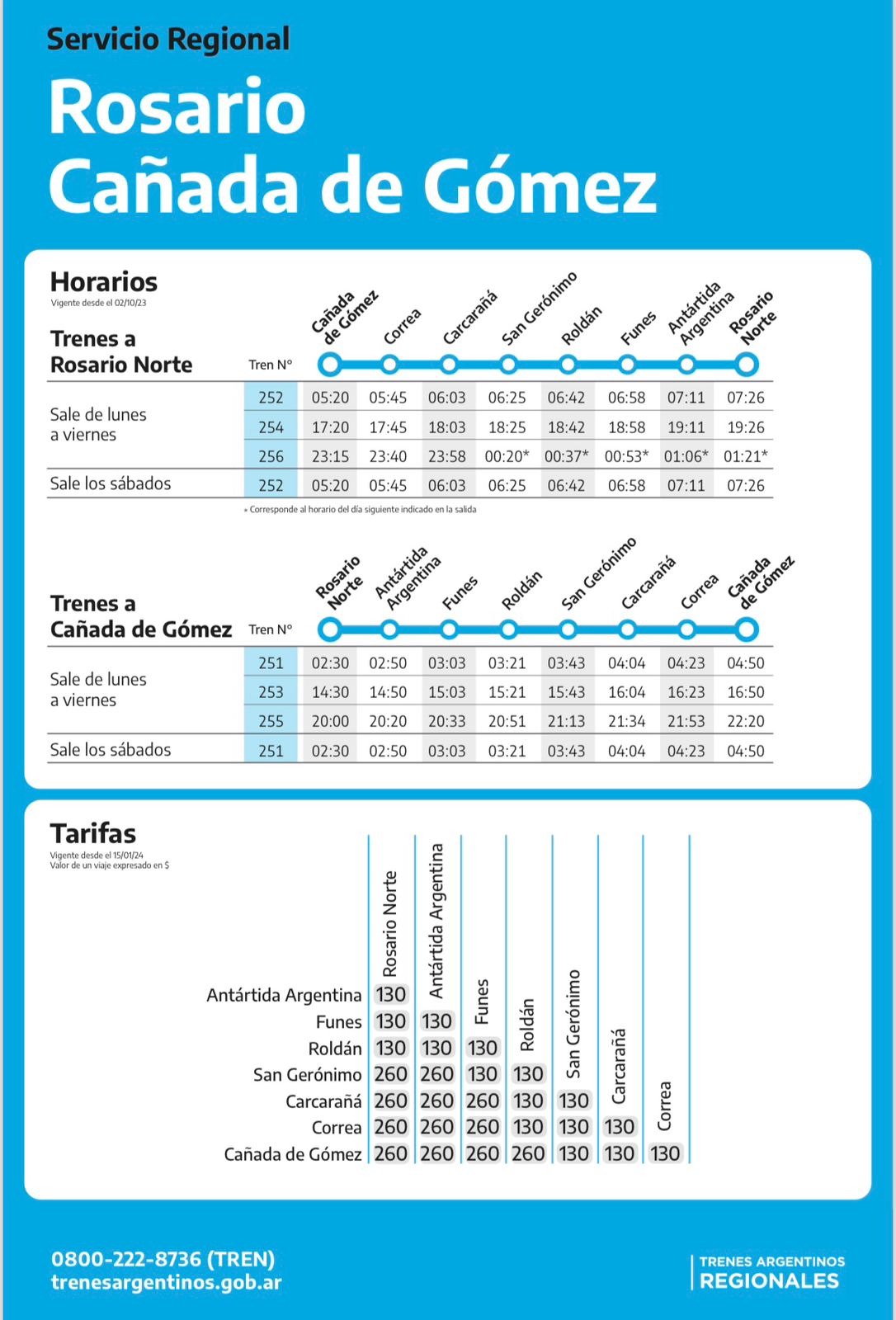 Por su parte, el servicio continúa funcionando con tres frecuencias diarias hacia Rosario y otras tres por día hacia Cañada de Gómez , además de contar con viajes también los sábados .