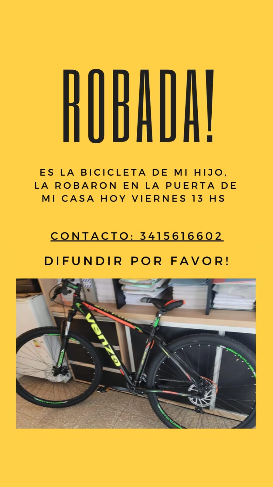 La bicicleta se trata de una Venzo rodado 29 y el mismo viernes la denuncia ingresó, tal testimonio de los vecinos, a la comisaría 23. “Nos atendieron pero no nos dieron una copia de nada, nos volvimos con la manos vacías, dijeron que no era necesario porque quedaba todo asentado en la comisaría”, sostuvo la vecina dueña de la bicicleta.