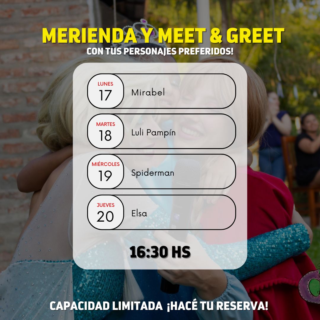 La hamburguesería ubicada en el paseo de compras Fisherton Plaza prepara un ciclo de meriendas de lunes a jueves durante las dos semanas de vacaciones. Arrancarán a las 16.30 hs y mientras los niños meriendan podrán encontrarse con sus personajes animados favoritos como Luli Pampín, Rapunzel, Elsa, Cenicienta, Peter pan, Campanita, Spiderman o Mirabel.