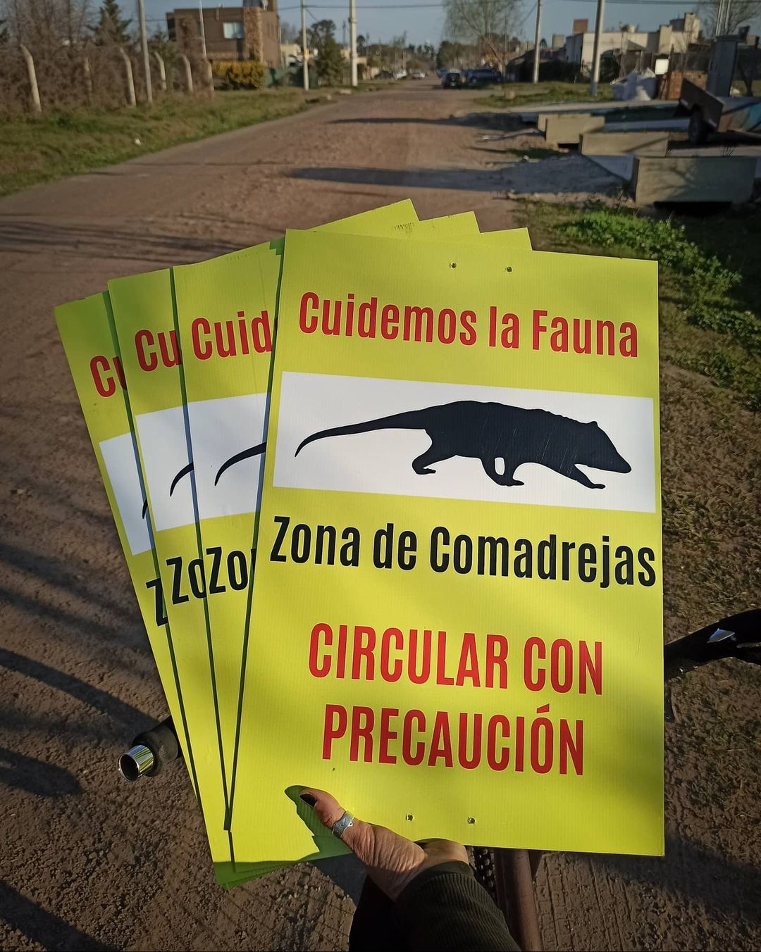 El fin de semana armó y colocó sus propios carteles que piden circular con precaución para evitar la muerte de zarigüeyas atropelladas. Los instaló en varios puntos de Funes, principalmente en algunas de las calles que más velocidad registran y donde suelen verse estos animalitos abandonados a su suerte. Pide replicar la medida en cada barrio y ofrece los archivos para que cada vecinal imprima su propia cartelería.