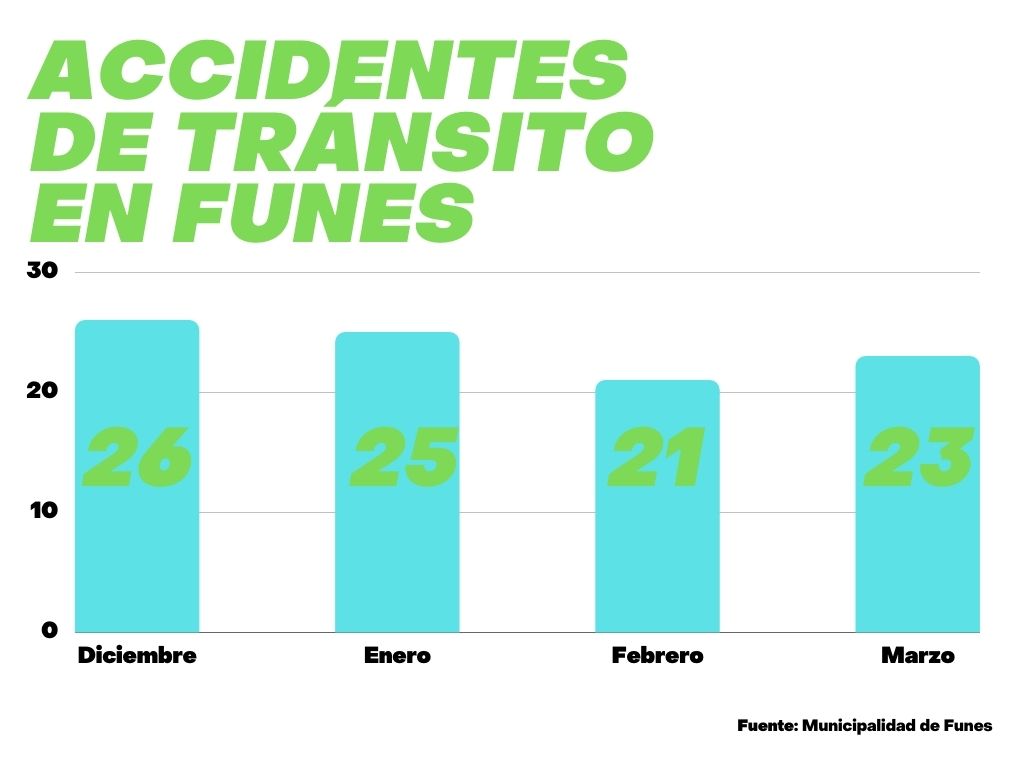 Casi uno por día. Entre el 2 de diciembre y el 29 de marzo se registraron 95 accidentes de tránsito en Funes. La cifra, que invita a la reflexión, pertenece a un informe oficial confeccionado por el municipio al que accedió InfoFunes.