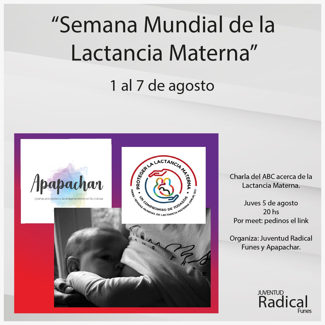 En el marco de la Semana Mundial de la Lactancia Materna que se celebra del 1 al 7 de agosto, Apapachar junto con la Juventud Radical de Funes organizaron para este jueves a las 20 una charla informativa sobre la lactancia materna.