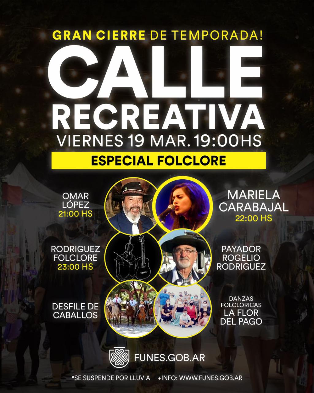 La Municipalidad organizó para este viernes a partir de las 19 la última edición de la Calle Recreativa con una temática muy especial: folclore. Frente al Museo Murray.