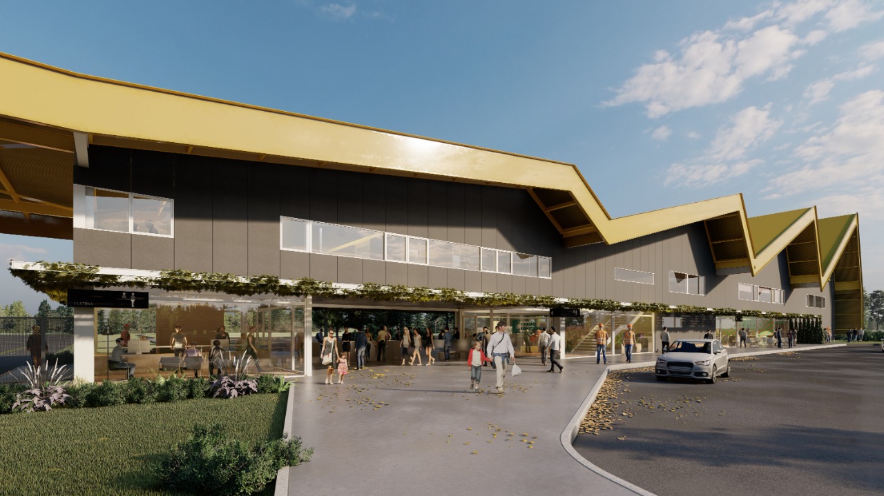 El edificio de ingreso propiamente dicho, que puede observarse y ya exhibe su silueta característica desde la autopista, estará dotado de un gran auditorio, un centro de negocios, un local gastronómico, una clínica de primeros auxilios y hasta una estación de bomberos.