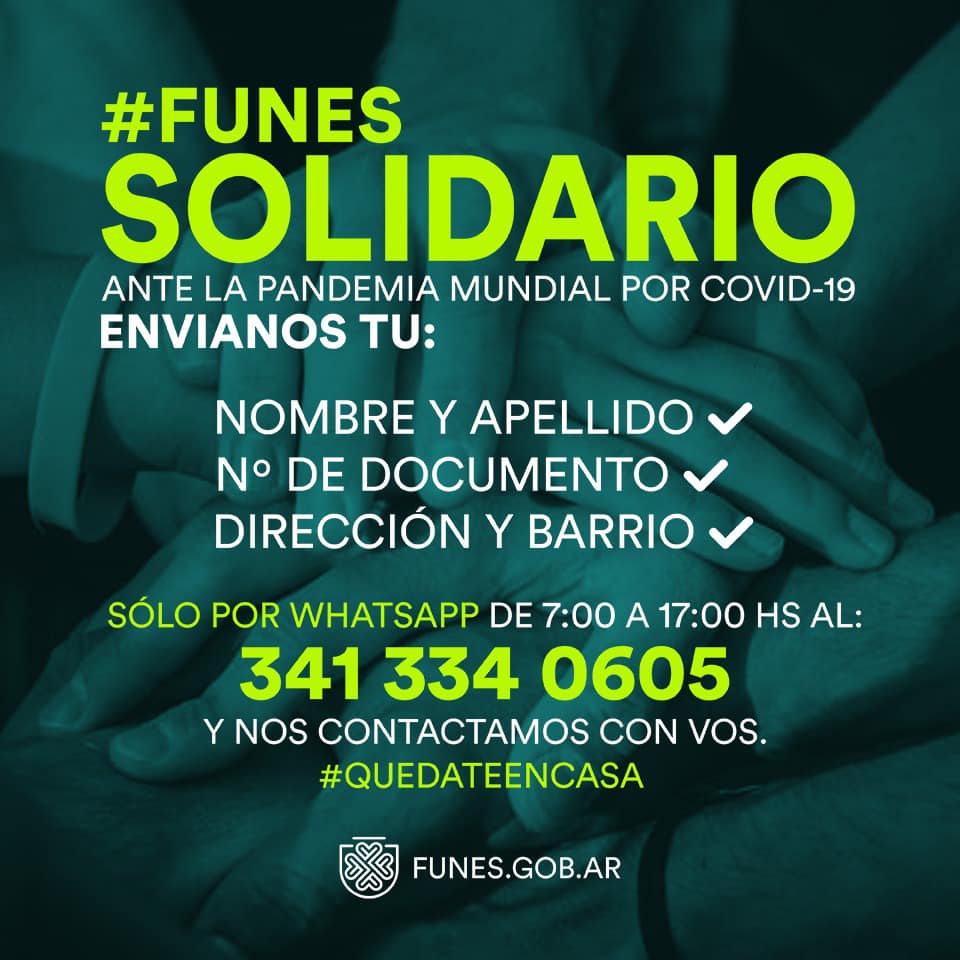 A partir de la “difícil situación que estamos atravesando”, el Municipio de Funes puso a disposición de sus vecinos un nuevo número telefónico para contactarse vía WhatsApp únicamente. A partir de ese contacto, se recibirán datos puntuales para armar una agenda solidaria.