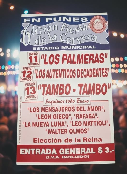 En el archivo histórico, publicado por Mauro Miguez, se puede ver el line up del festival: Los Palmeras, Los Auténticos Decadentes, León Gieco, Ráfaga, La Nueva Luna, Leo Mattioli, Walter Olmos y Tambó-Tambó eran las figuras que cada noche durante los fines de semana de enero llegaban a Funes para hacer vibrar al público.