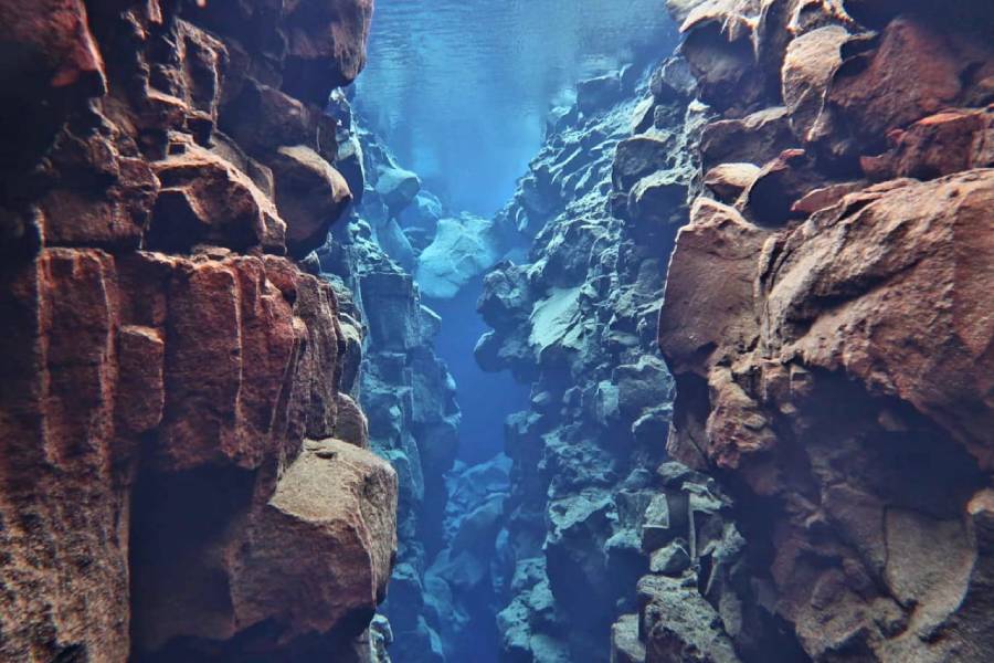 La falla de Silfra, en Islandia, está situada entre las placas tectónicas norteamericana y euroasiática, en la encrucijada de dos continentes, y figura entre los 10 mejores lugares del mundo para bucear. Se caracteriza por sus aguas heladas y cristalinas, que proceden del deshielo del glaciar Langjökull; y por su increíble visibilidad, que posibilita llegar hasta las profundidades de esta maravilla geológica.