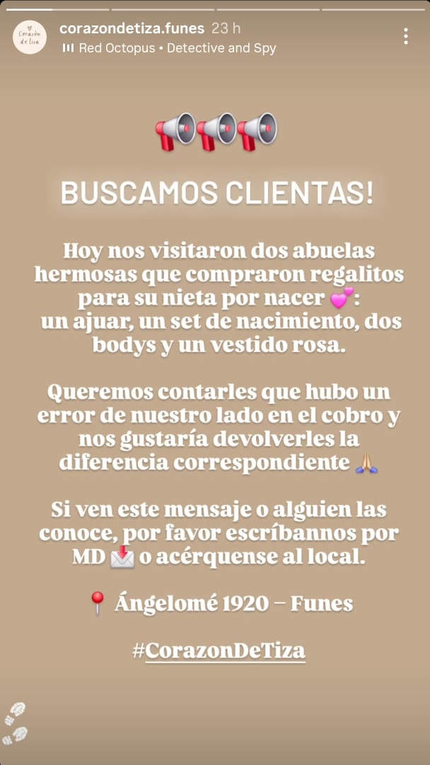 Todavía hay gente buena: dos mujeres fueron el sábado a Corazón de Tiza (@corazondetiza.funes), un local de indumentaria de bebés y niños ubicado en Angelomé 1920. Al abonar la compra hubo un error de parte del local, que les cobró un monto mayor, y al darse cuenta, las vendedoras publicaron un posteo en sus redes sociales para poder encontrarlas y devolverles esa diferencia.
