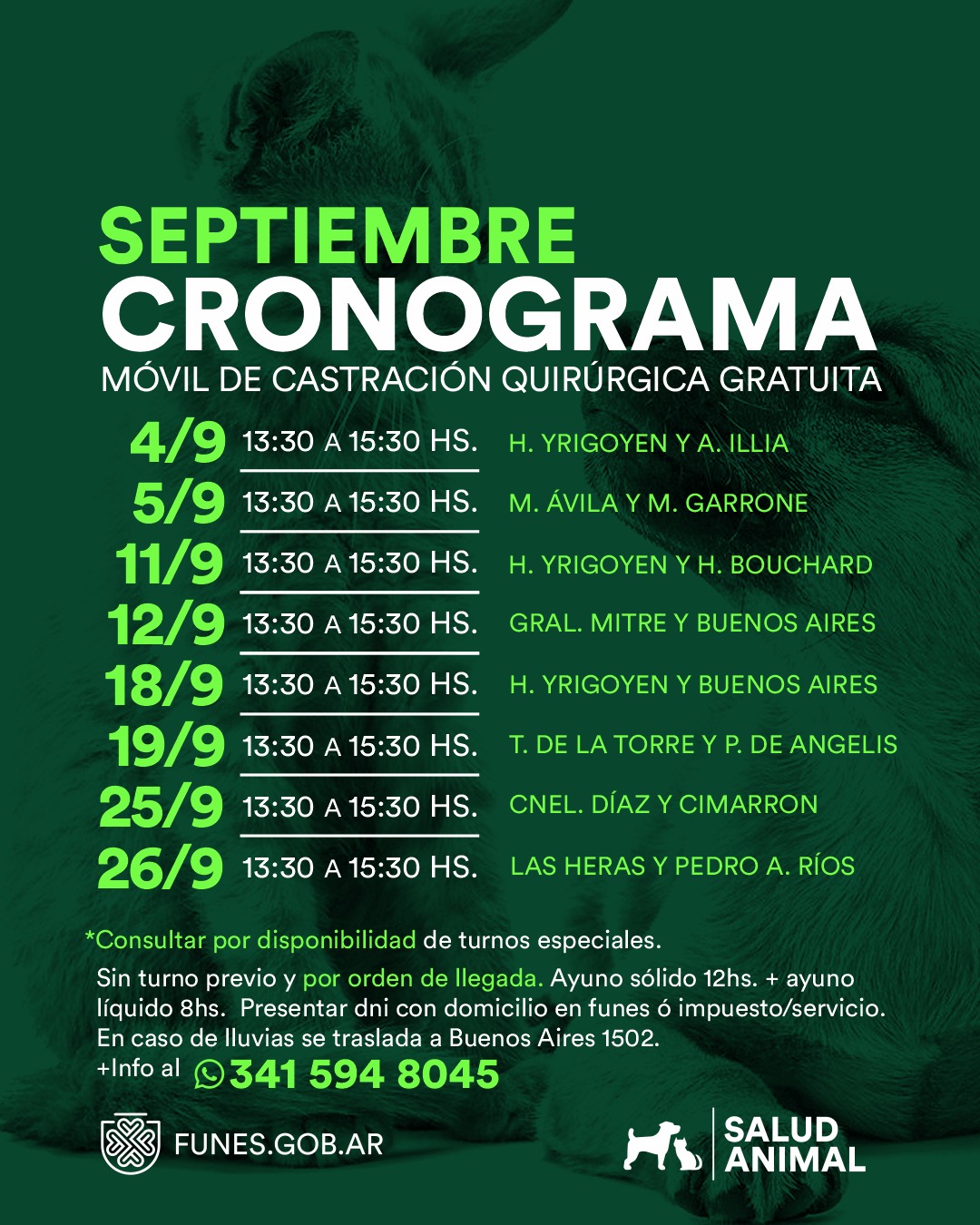 Desde la Secretaría de Salud Animal de la Municipalidad de Funes informaron las nuevas fechas del cronograma de castraciones gratuitas a perros y gatos correspondiente al mes de septiembre. Desde el lunes se podrán llevar a perros y gatos, sin turno previo, siempre de 13.30 a 15.30, para la intervención en Yrigoyen y Avenida Illía.
