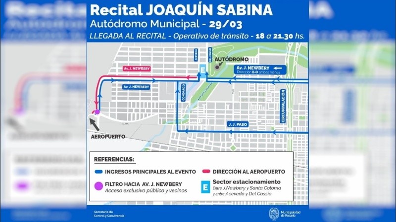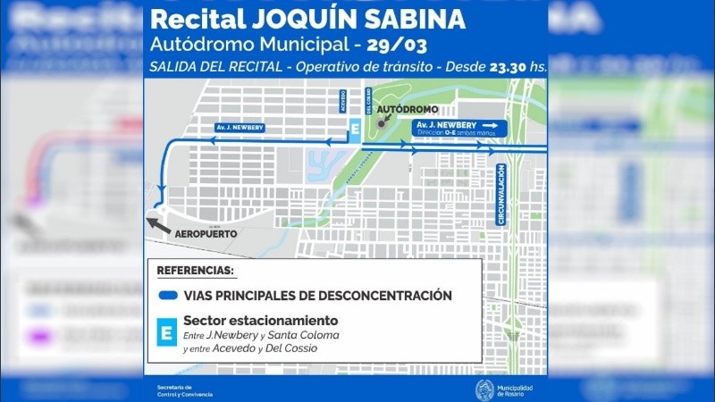 Lo más destacado del operativo es que la Av. Jorge Newbery se convertirá en mano única a partir de las 18.30 hasta las 21.30 horas, circulando de Este a Oeste, desde Av. de Circunvalación hasta Av. García del Cossio (ingreso al Autódromo). A su vez, en la rotonda del Aeropuerto habrá un filtro a cargo de los agente de control que permitirá el acceso a la Av. Jorge Newbery a las personas que se dirijan al recital de Sabina, como también a los vecinos que residan en la zona.