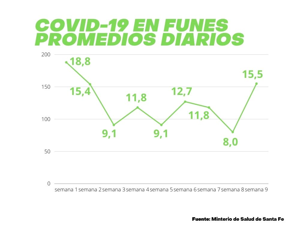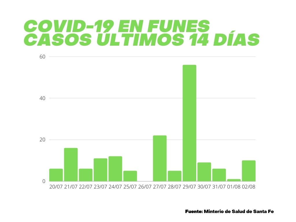 Así, se observa que en las últimas dos semanas Funes informó 165 casos. Es decir, alrededor de 11,8 positivos diarios en promedio.