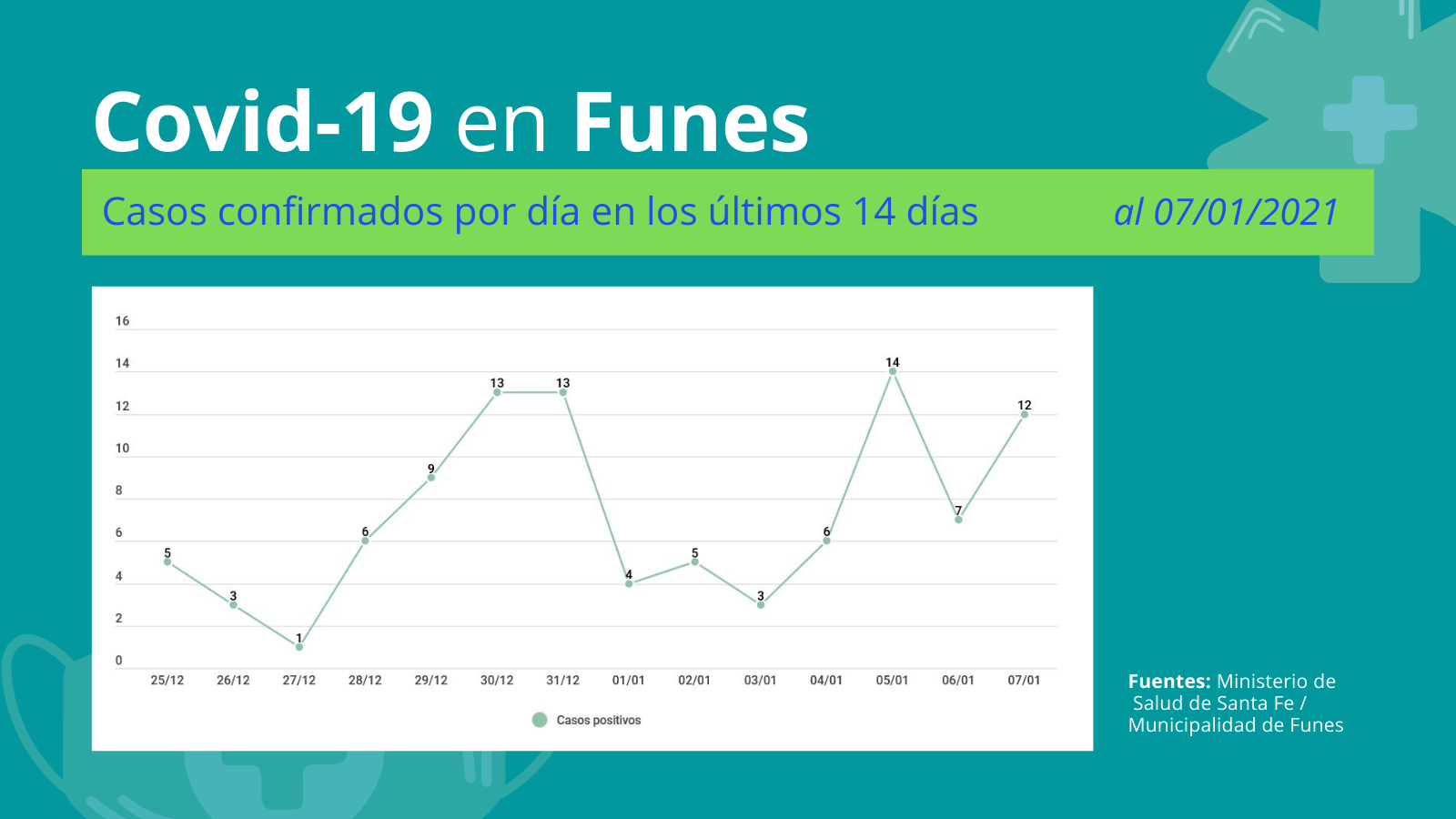 En los últimos 14 días, se registraron 96 nuevos casos positivos en la ciudad. El último registro, de este jueves 7 de enero, fue de 12 contagios. Vale recordar que el primer caso positivo oficial en Funes fue el 30 de marzo de 2020.