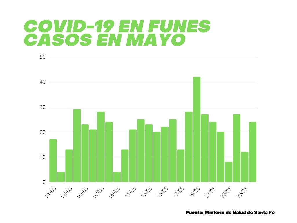 Aunque aún faltan cinco días para que termine, mayo ya es el peor mes en cantidad de contagios por Covid-19 en Funes desde que comenzó la pandemia. Con los 24 casos nuevos informados este miércoles por el Ministerio de Salud provincial, la ciudad ya acumula 537 casos nuevos en los últimos 26 días.