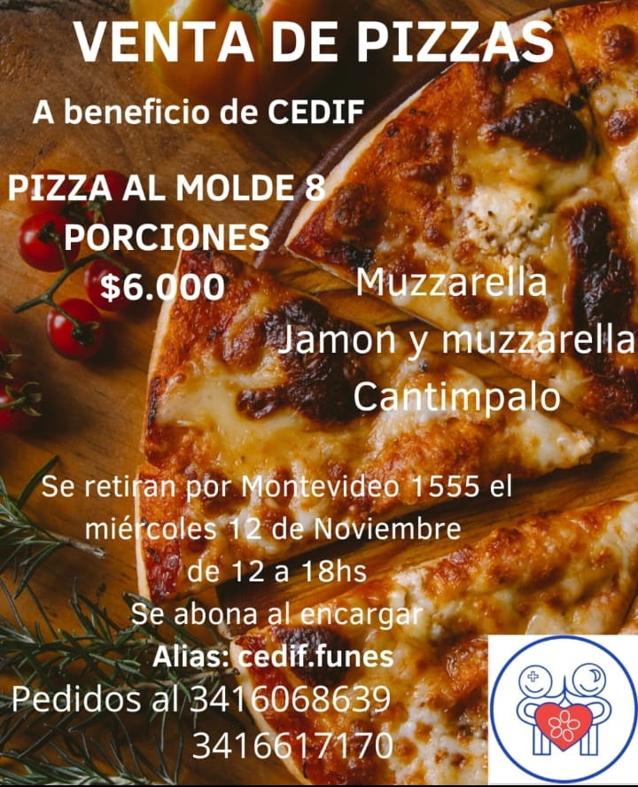 Las mismas, listas para calentar y consumir, al molde, de ocho porciones, cuestan $6 mil cada una y se pueden encargar al 3416068639 o bien al 3416617170. Hay de muzzarella, cantimpalo o de jamón y queso. Las mismas se podrán retirar el miércoles 12 de noviembre, de 12 a 18, en el Cefid: Montevideo 1555.