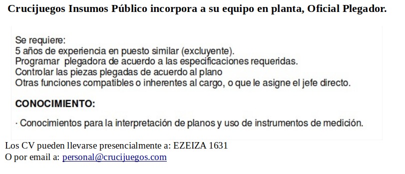 La firma encargada de la realización y colocación de juegos infantiles lanzó una búsqueda de oficial plegador. Los detalles en la nota.