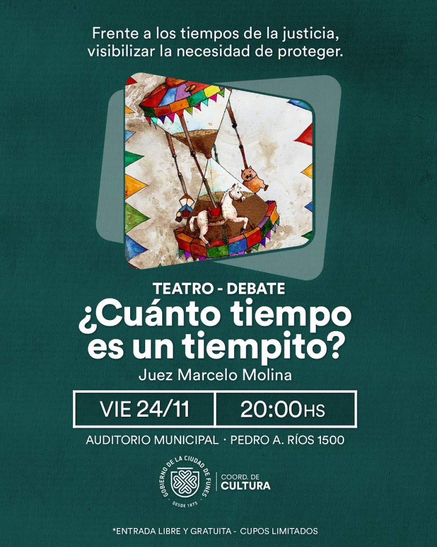 Este viernes, a las 20, en el Galpón Municipal, se presentará la obra ¿Cuánto tiempo es un tiempito?, creación del juez Marcelo Molina basada en el libro homónimo lanzado en 2016. El título y temática surgió frente a la pregunta que una nena, de tres hermanitos, le hizo a Molina sobre cuándo llegaría una familia para adoptarlos. Él le respondió que faltaba “un tiempito”, a lo cual ella preguntó: ¿Cuánto tiempo es un tiempito? La presentación, de entrada gratuita, incluirá luego una charla debate en la que los actores y autor, todos abogados y demás trabajadores del Poder Judicial, responderán a las preguntas del público. Pero eso no es todo: el intendente Roly Santacroce confirmó que la obra será declara de Interés Municipal, mención que entregarán durante la presentación. Reconocimiento al cual Molina dijo estar “agradecido con esta mención”. “No es algo menor, está bueno que se reconozcan este tipo de trabajos, de historias y es muy grato que tantos los lugares que visitamos, como su público, nos acompañen”, agregó.