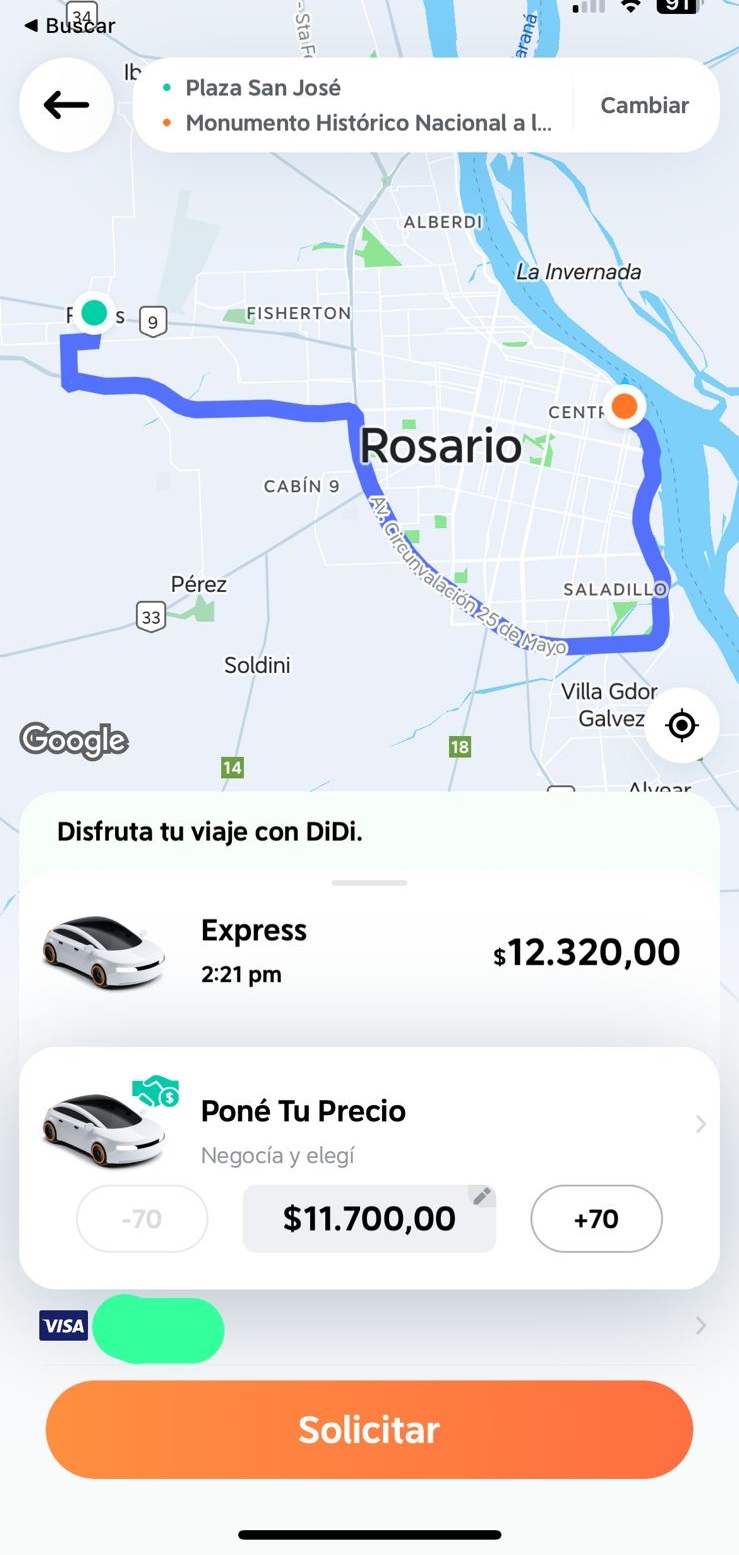 Para ilustrar las tarifas actuales, InfoFunes realizó una simulación de un viaje desde la Plaza San José hasta el Monumento Nacional a la Bandera. Utilizando “DiDi Poné Tu Precio”, el costo aproximado fue de $11.000, mientras que con “DiDi Express” ascendía a $12.000. En un viaje compartido entre cuatro personas, el gasto individual sería de $3.000, ofreciendo una alternativa económica para quienes se desplazan entre el centro de Funes y Rosario.