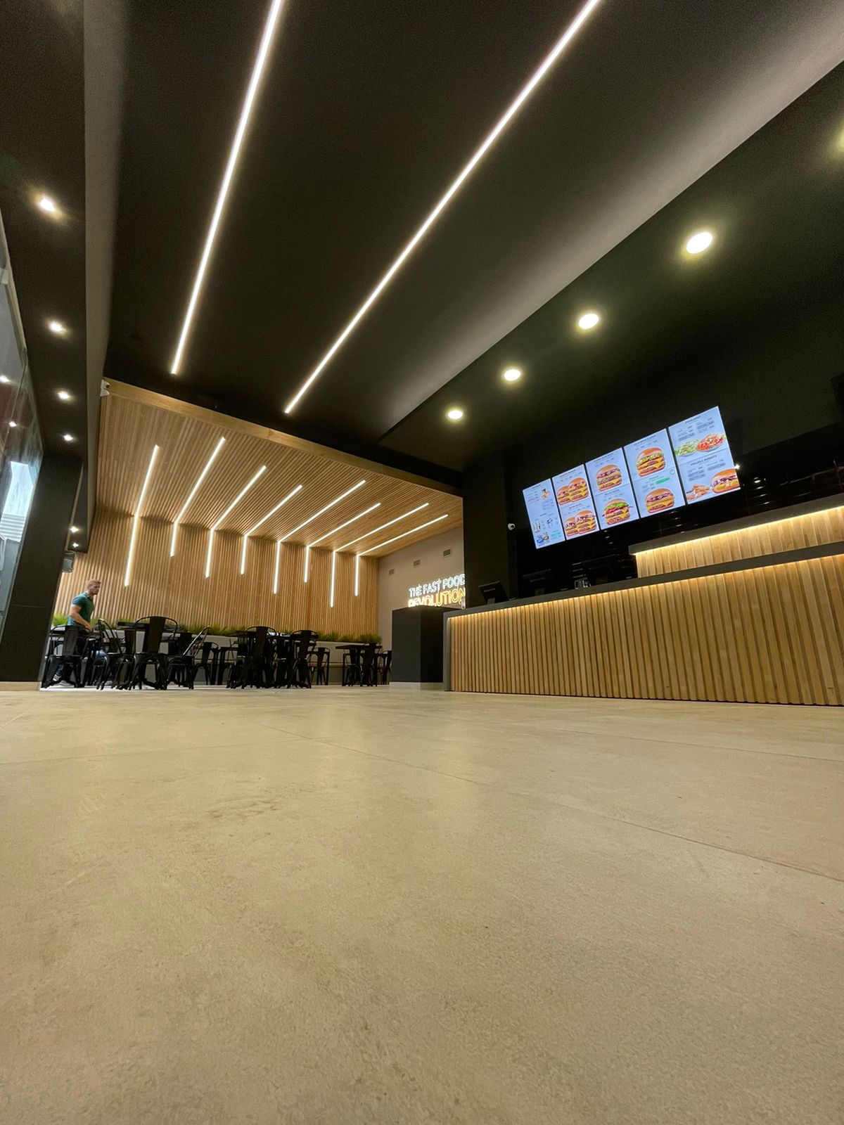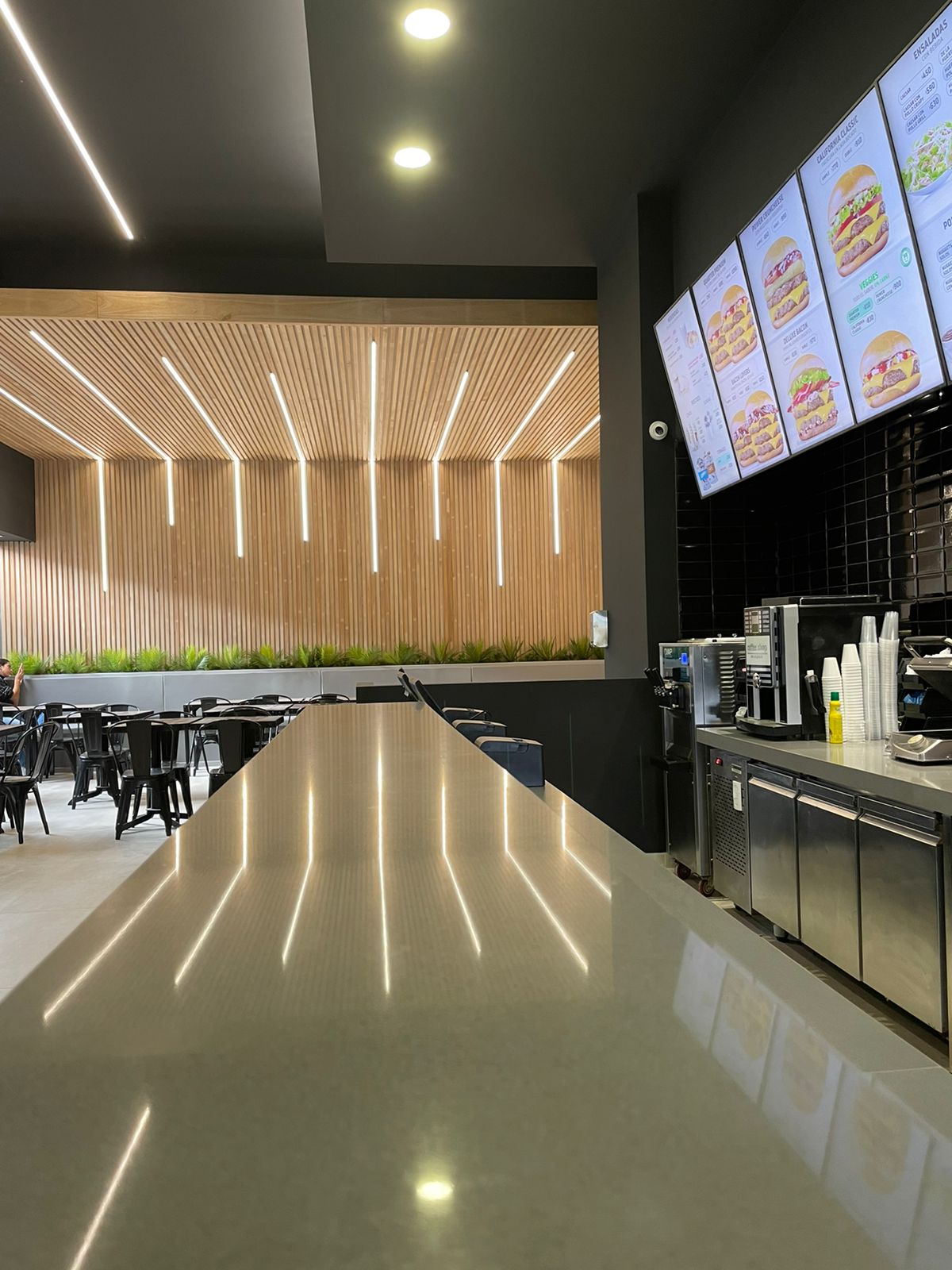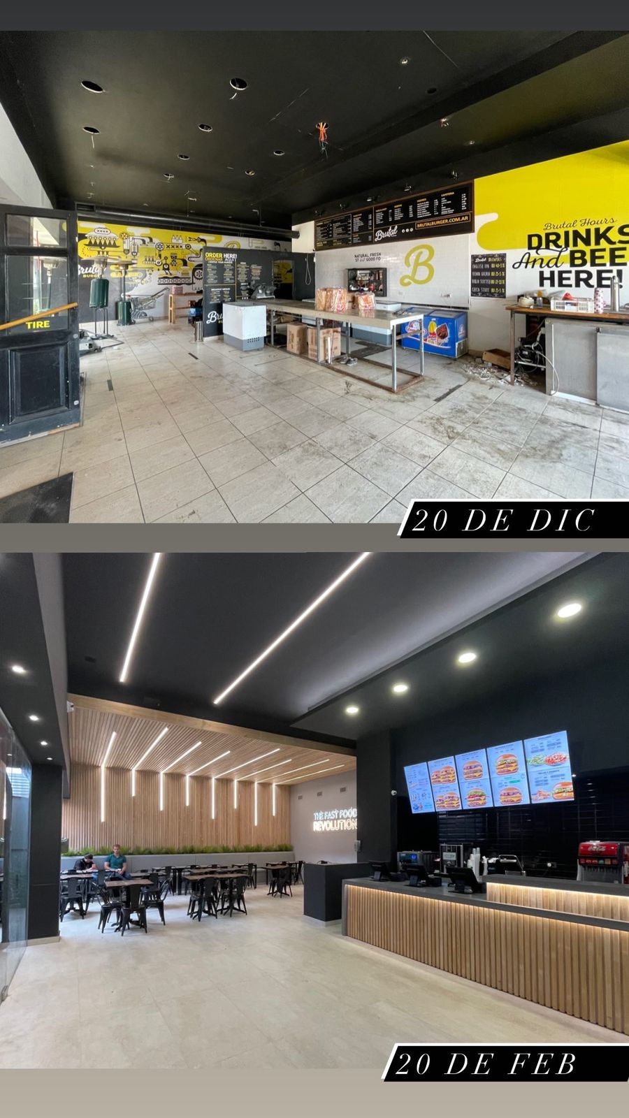 “Desde lo estético, buscamos un diseño atractivo, por lo que significa un local de comida rápida en un shopping, pero a su vez, original. Algo en lo que nos basamos desde el primer momento fue el slogan del comercio: “the fast food revolution”. La palabra revolution la tomamos como nuestra base para el diseño interior del local. Lo llevamos a cabo mediante el diseño de espacios amplios y de altura considerable en la zona del salón, la parte del “comedor” se separa espacialmente por un cielorraso de listones de madera y tiras led de distintos largos embutidas en el mismo. A esto se le suman carteles luminosos que simulan neón, mesadas de material reflectivo, y colores contrastantes. Todas estas decisiones conjugadas, nos permitian que la palabra de su slogan se relacione directamente con su diseño”, fundamentó el joven.