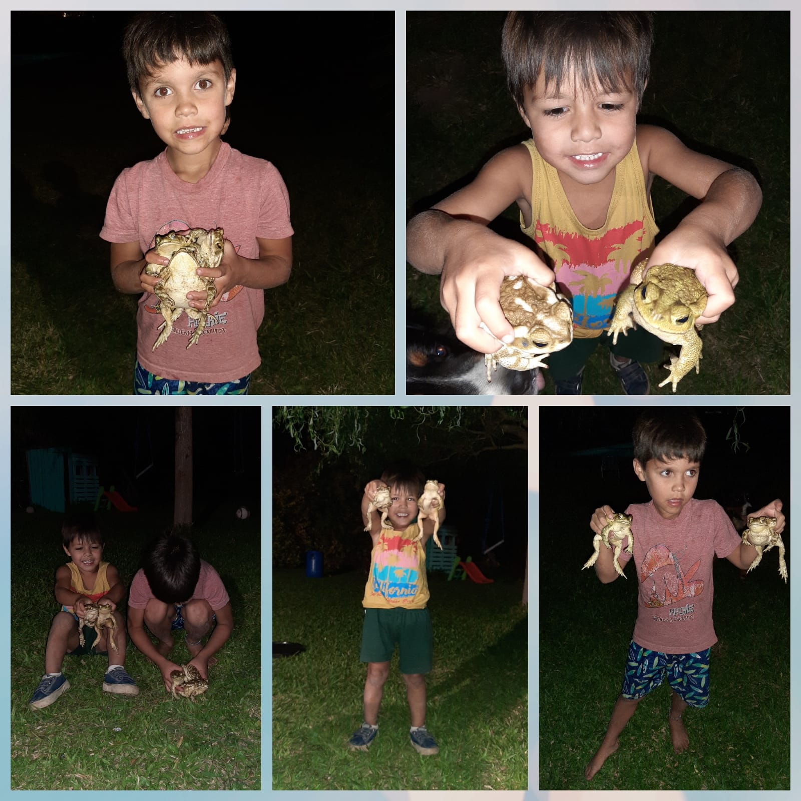 Tomás y Ulises de 4 y 5 años son dos hermanitos que viven en Funes y por las noches salen al patio de su casa a buscar a los sapitos que aparecen. Juegan y les gusta tomarse fotos juntos a ellos.