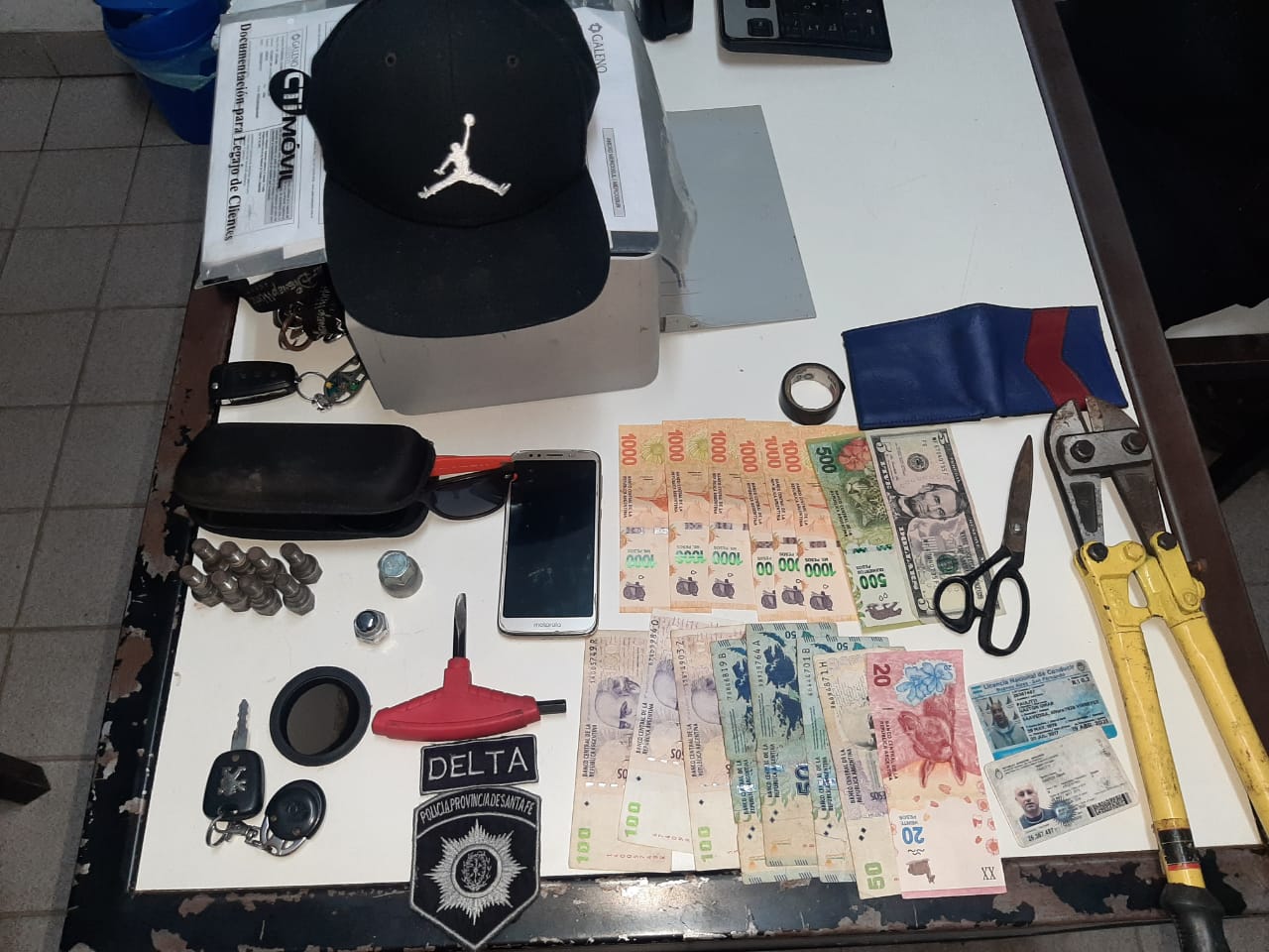 Al malviviente se le secuestró dinero (alrededor de sietemil pesos y cinco dólares), herramientas como destonilladores, llaves, gatos, tijera y pinza rompecandados (también conocida como tijera corta pernos). La Policía también encontró en el baúl del Peugeot varios bulones de rueda de auto. En tanto que la chapa patente trasera se encontraba alterada con cinta aisladora, de manera que pareciera una numeración distinta.