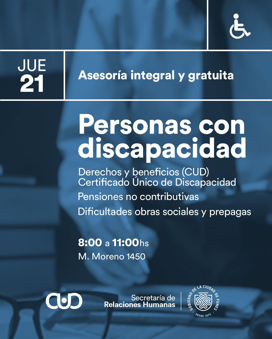 Con el objetivo de empoderar a las personas con discapacidad y garantizar que sus derechos sean respetados y protegidos, los profesionales recibirán a las y los interesados en la oficina de Moreno 1450, de manera gratuita, a quienes deseen conocer más sobre temas como pensiones no contributivas, problemas con obras sociales y prepagas, la tramitación del Certificado Único de Discapacidad (CUD) y los derechos y beneficios que esto conlleva.