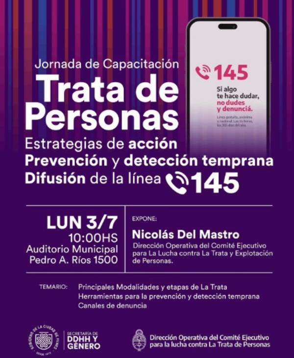 La capacitación estará a cargo de Nicolás Del Mastro, miembro del Comité Ejecutivo Nacional Contra la Trata de Personas, dependiente de la Jefatura de Gabinete. El temario aborda ejes referidos a la trata y explotación de personas en Argentina: definiciones, normativas y etapas, modalidad de captación y de trata de personas, herramientas de detección y prevención temprana, canales de denuncia y protocolos de intervención, entre otros.