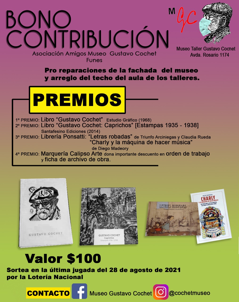 El costo del bono es de sólo $100 y con su adquisición se participará en un concurso con cuatro premios. El primer premio es el libro "Gustavo Cochet", con fragmentos del "Diario de un escritor"y textos de Emilio Ellena, Mele Bruniard y Eduardo Serón, publicado en 1968; el segundo premio es el libro de grabados con temática de la Guerra Civil Española "Gustavo Cochet: Caprichos"; el tercer premio son dos libros: "Letras robadas" y "Charly y la máquina de hacer música". Por último, el cuarto premio es un importante descuento en la marquería Calipso Arte.