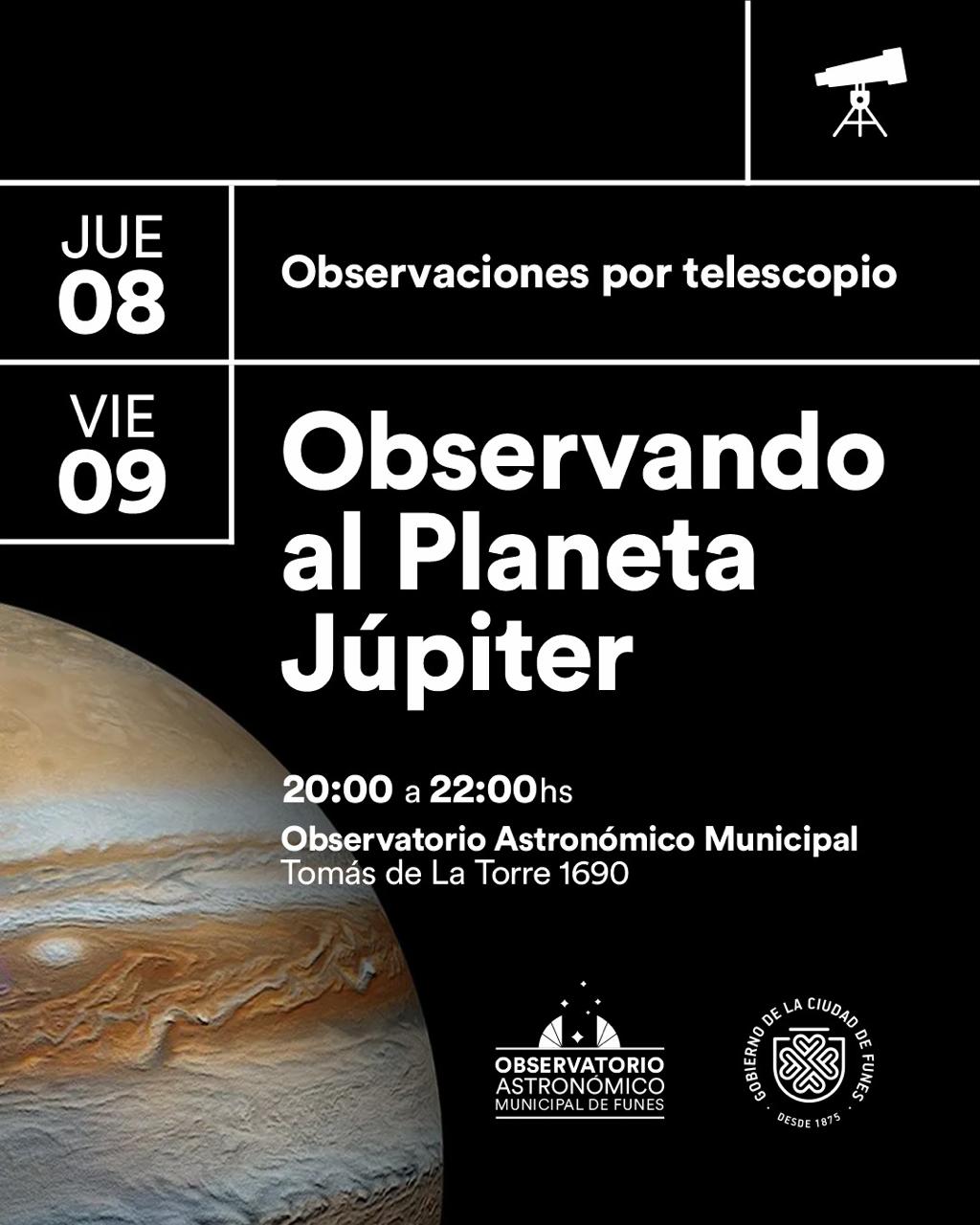 El jueves 8 y viernes 9 de febrero, a partir de las 20, se podrá disfrutar de la observación del gigante Júpiter, el imponente planeta gaseoso 1300 veces más grande que la Tierra, a través de nuestros telescopios.