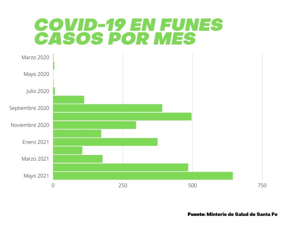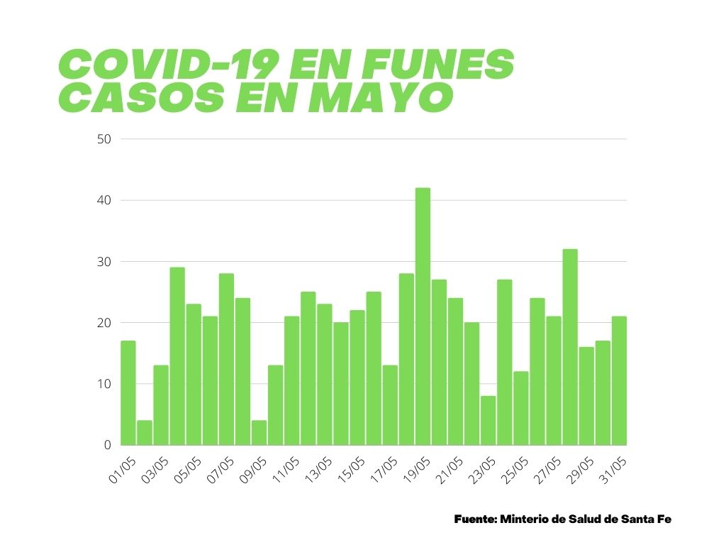 Mayo cerró con un récord absoluto de contagios de Covid-19 en Funes y así se convirtió en el peor mes en este sentido desde que comenzó la pandemia. Con los 21 casos que se sumaron este lunes, la ciudad acumuló 644 casos en total a lo largo de todo el mes, siempre según datos oficiales del Ministerio de Salud provincial.