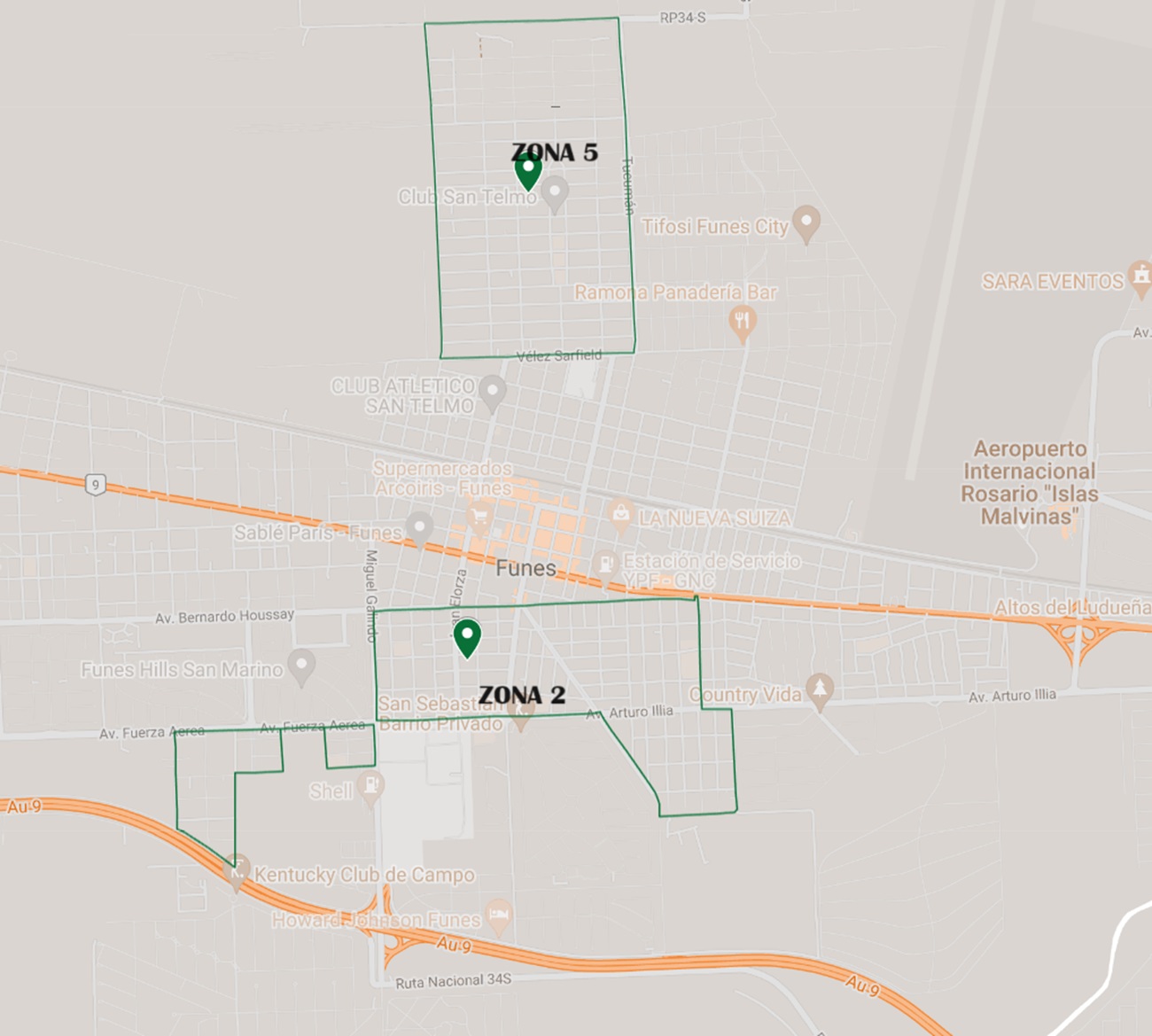Lo que distingue a estas nuevas áreas comerciales es la creación de microclimas comerciales, donde se congregan una variedad de negocios que van más allá de los tradicionales establecimientos del área central delimitadas por las calles Yrigoyen, San José y Santa Fe. En ese sentido, el desarrollo comercial más notable se evidencia en la Zona 2, marcado junto a la Zona 5 en el mapa a continuación: