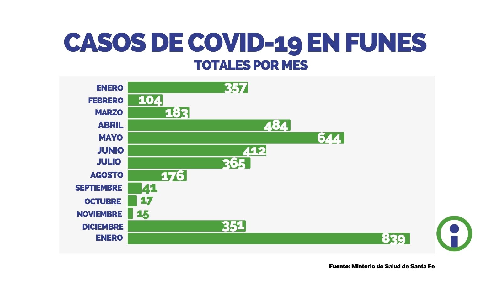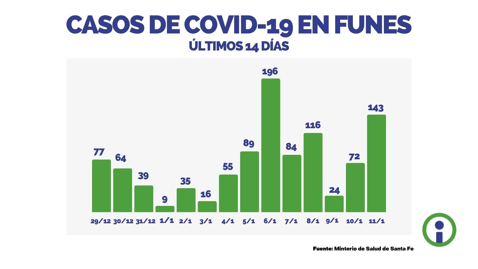 En apenas 11 días, enero ya registró más casos confirmados de Covid-19 en Funes que cualquiera de los meses anteriores desde que comenzó la pandemia. Con los 143 nuevos contagios informados por el Ministerio de Salud provincial este martes, la ciudad acumula 839 positivos en lo que va del mes. Un récord si se tiene en cuenta que, hasta ahora, mayo de 2021 había sido el mes con peores cifras al registrar 644 casos.