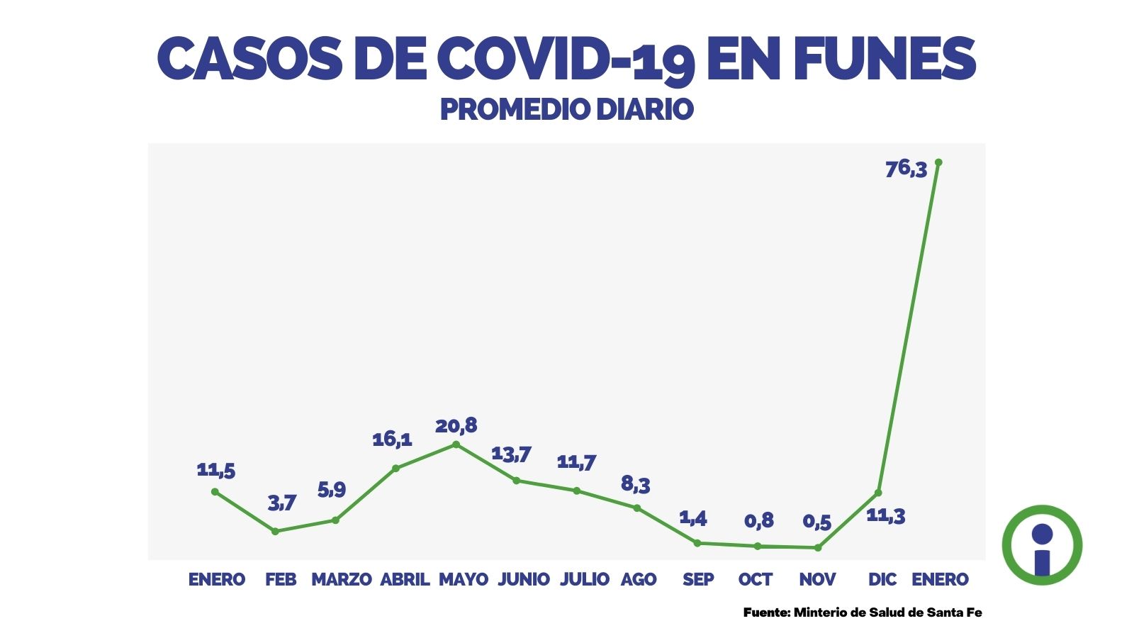 Funes muestra, en la actualidad, un promedio de 76 casos por día. Es récord. El pico máximo de este registro se había dado en mayo de 2021, con casi 21 casos diarios. Si se abre la mirada a los últimos meses, el salto es enorme: en octubre y noviembre el promedio no llegaba a un caso por día. En diciembre, cerró con 11 contagios diarios. La curva se aceleró notablemente en enero y recién transcurrió un tercio del mes.