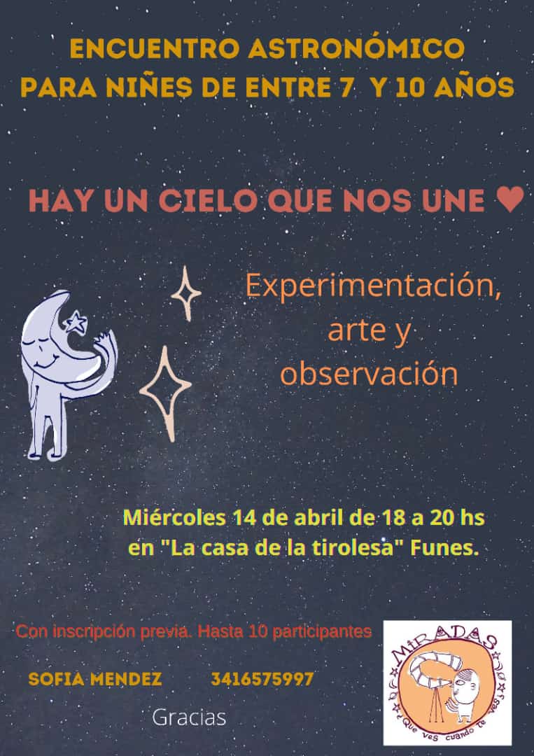 El grupo "Miradas ¿Qué ves cuando te ves?" organizó para este miércoles 14 de 18 a 20 un encuentro astronómico para niños y niñas en "La casa de la tirolesa" en la ciudad de Funes.