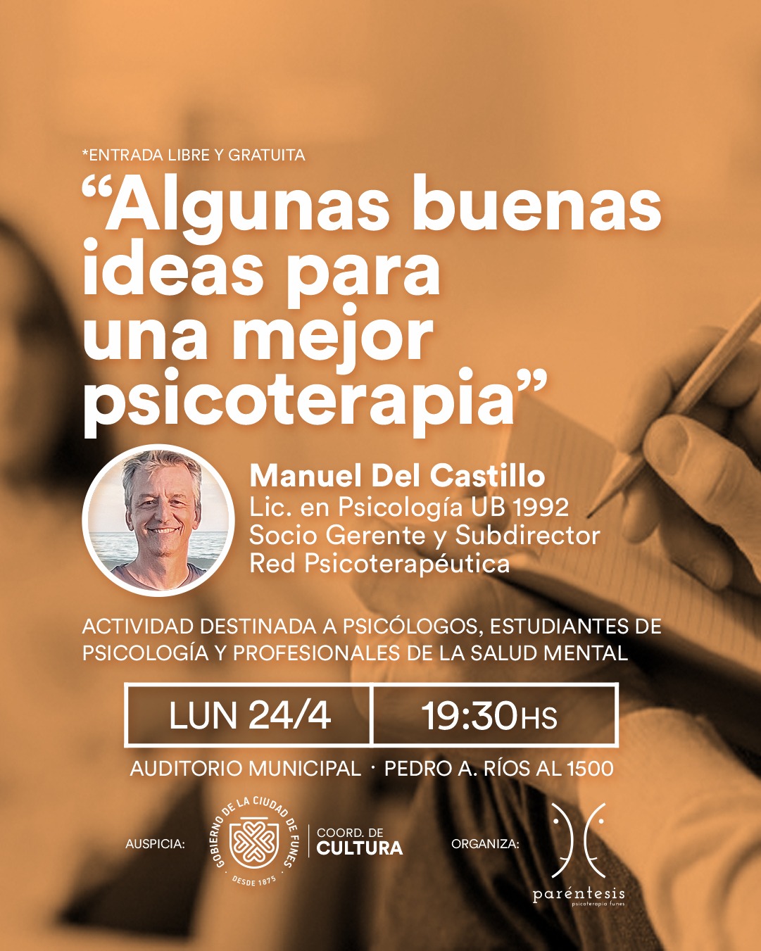 La actividad, titulada "Algunas buenas ideas para una mejor psicoterapia", será dictada por Manuel Del Castillo, Licenciado en Psicología, Socio Gerente y Subdirector de la Red Psicoterapéutica.
