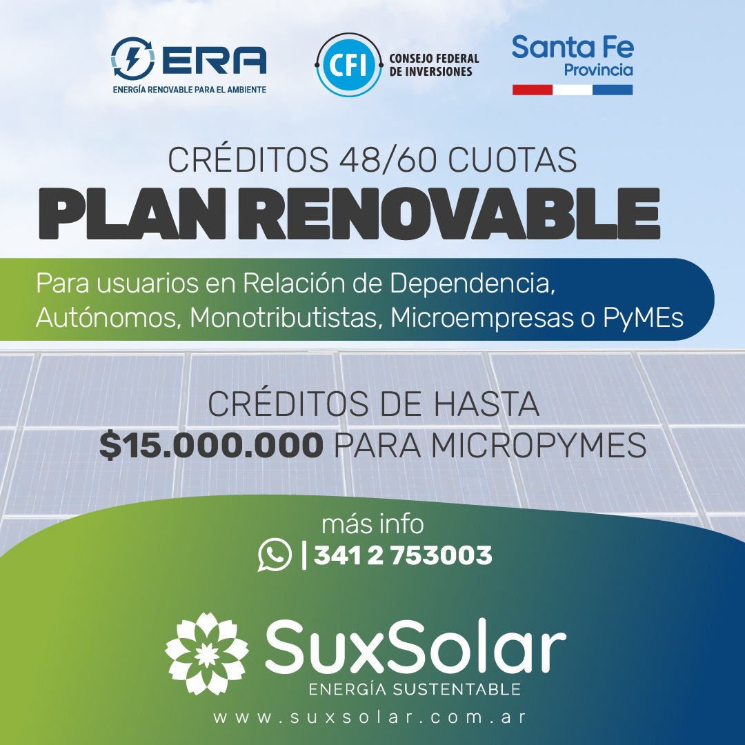 En Funes y la zona, el mencionado financiamiento a tasas muy bajas puede gestionarse a través de Sux Solar (Ruta 9 N°972) que se encuentra registrada como proveedor oficial de la EPE. Para monotributistas, autónomos y trabajadores en relación de dependencia el financiamiento llega hasta $2.250.000. En tanto que para microempresas y Pymes llega hasta $20.000.000.
