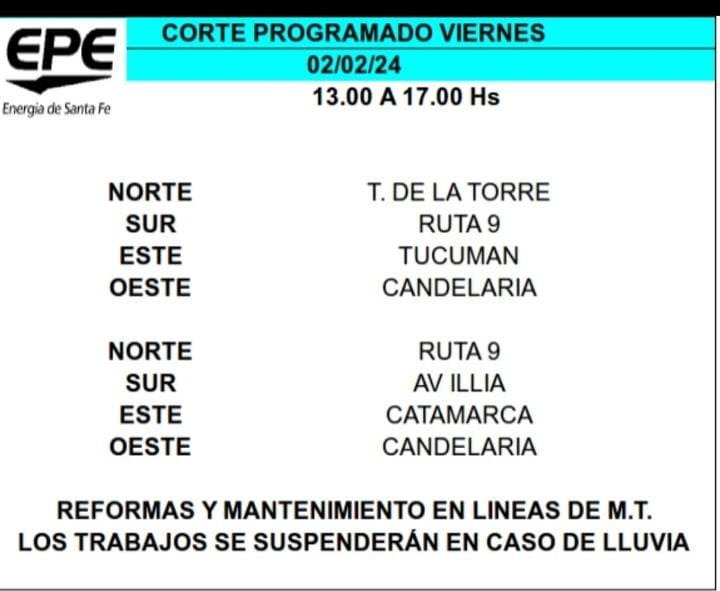 La Empresa Provincial de la Energía (EPE) informó que interrumpirá el servicio de electricidad en el centro de Funes este viernes, en el horario de 13 a 17.