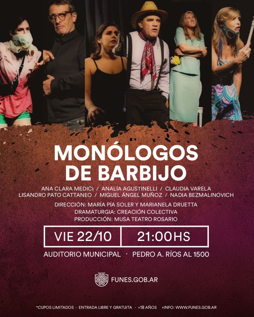“Monólogos de Barbijo” es la primera obra teatral que se realizará este viernes a las 21 en el nuevo Auditorio Municipal, en la misma participan artistas locales y de alrededores. Es una producción de Musa Teatro Rosario.