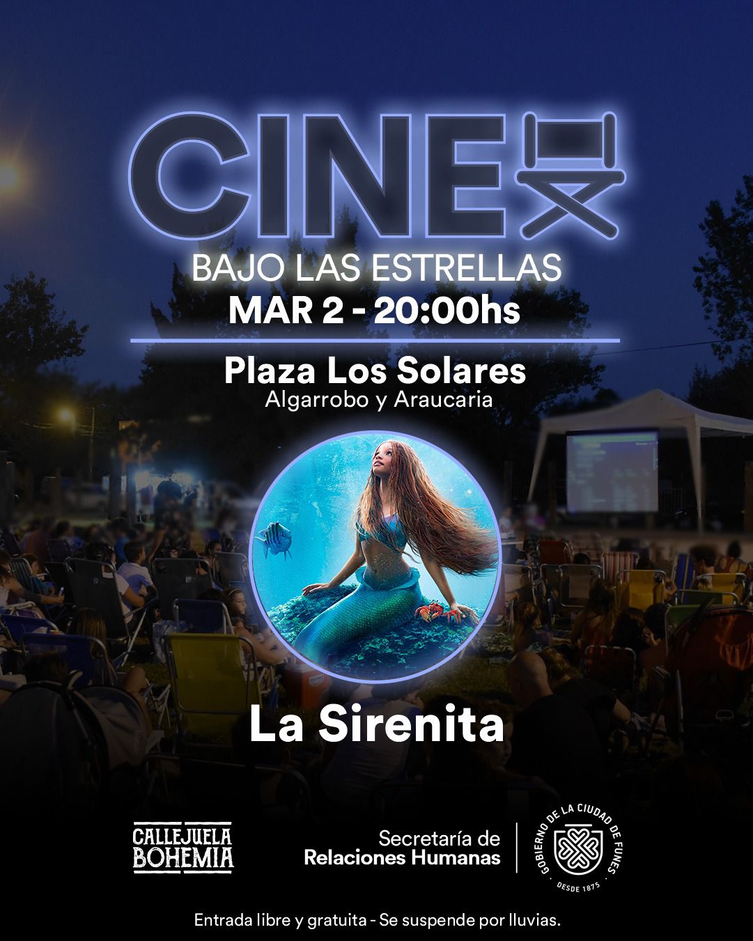 Este martes, desde las 20, el cine al aire libre llega a Plaza Los Solares, donde se proyectará la película recientemente estrenada “La Sirenita”, una exitosa adaptación cinematográfica que da vida al clásico cuento de Disney, siguiendo a la sirena Ariel mientras se enfrenta. desafíos, descubre el significado del amor y encuentra su propio camino hacia la felicidad.