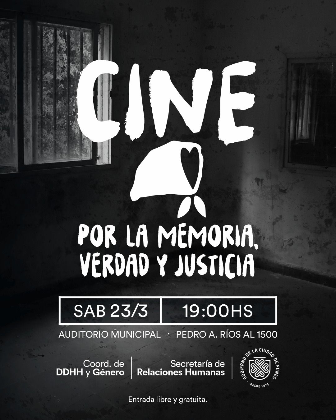 La Municipalidad de Funes organiza una nueva jornada de concientización con la propuesta de un "Cine por la Memoria, Verdad y Justicia", que se llevará a cabo el sábado, a las 19, en el Auditorio Municipal, ubicado en Pedro A. Ríos 1500. La entrada es libre y gratuita.