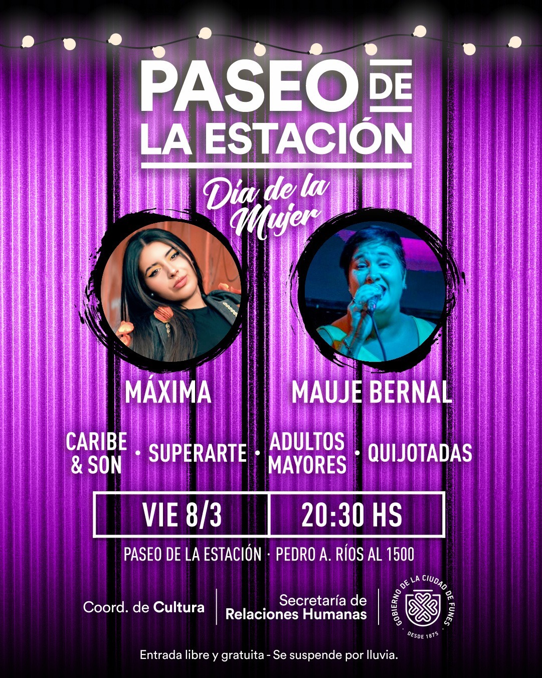 Este viernes, desde las 20, el Día de la Mujer se conmemora en el Paseo de la Estación (Pedro Ríos al 1500). Allí, y con entrada libre y gratuita, se invita a las y los vecinos de Funes para disfrutar de una noche en honor a las mujeres trabajadoras de la ciudad, con los shows en vivo de Mauge Bernal (@maujebernal) y Máxima (@maximedin_).