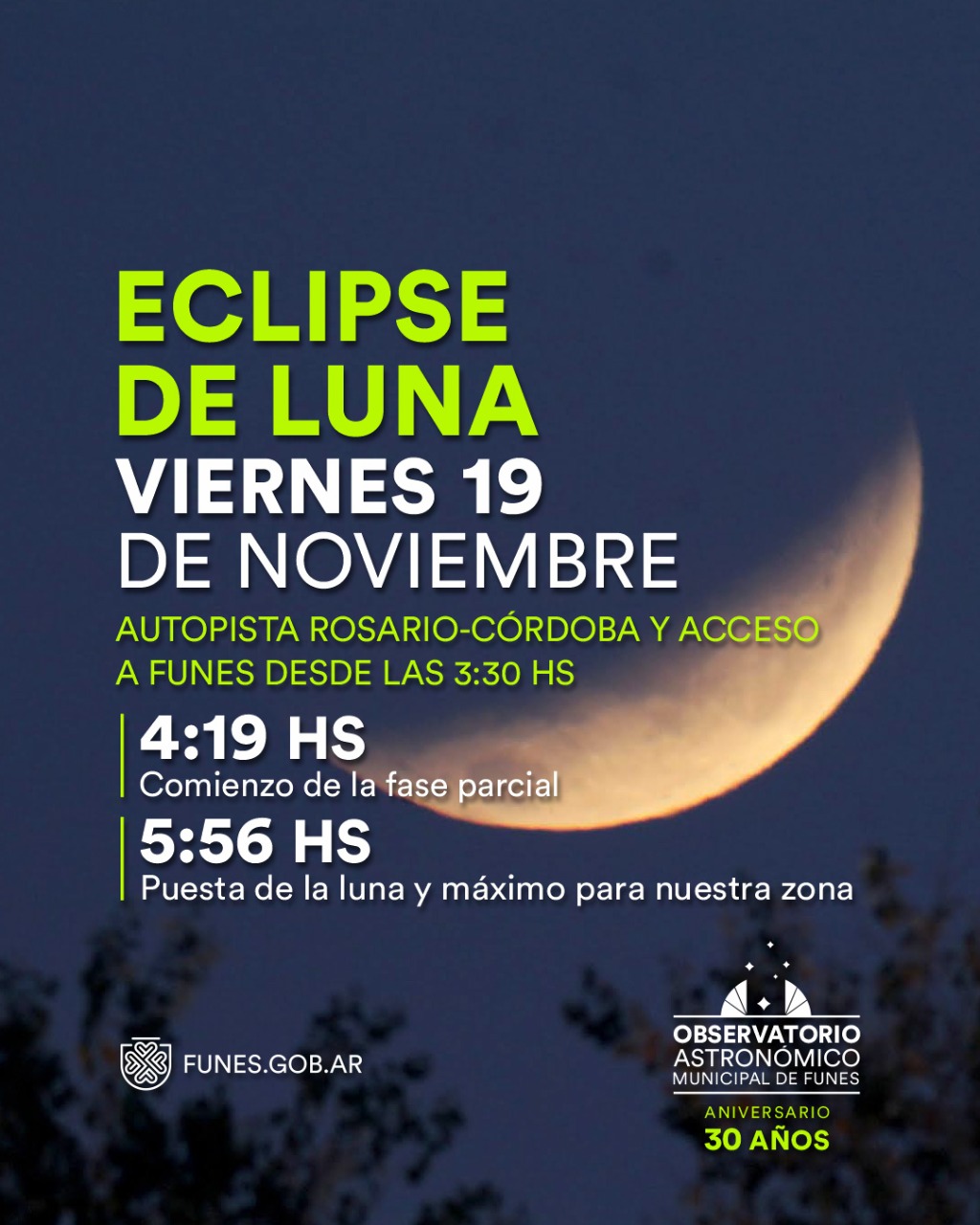 Este viernes 19 a partir de las 3.30 se podrá observar un eclipse de luna en el cielo funense, y el Observatorio Municipal organizó un evento en el acceso de la autopista Rosario-Córdoba para poder ir a verlo.