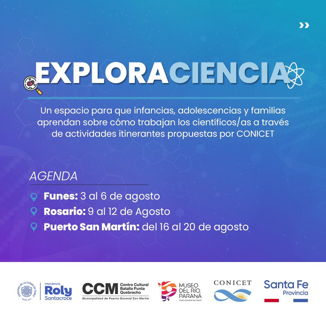 Desde el jueves 3 al domingo 6 de agosto, Funes sede de “Explora Ciencia”, una muestra itinerante del Consejo Nacional de Investigaciones Científicas y Técnicas (Conicet), y la Secretaría de Ciencia, Tecnología e Innovación de la provincia de Santa Fe. Se trata de un espacio que busca enseñar cómo trabajan los científicos en distintas áreas a través de diversas actividades itinerantes. El lugar elegido para desarrollar la jornada es el galpón municipal, ubicado en Pedro A. Ríos al 1500.