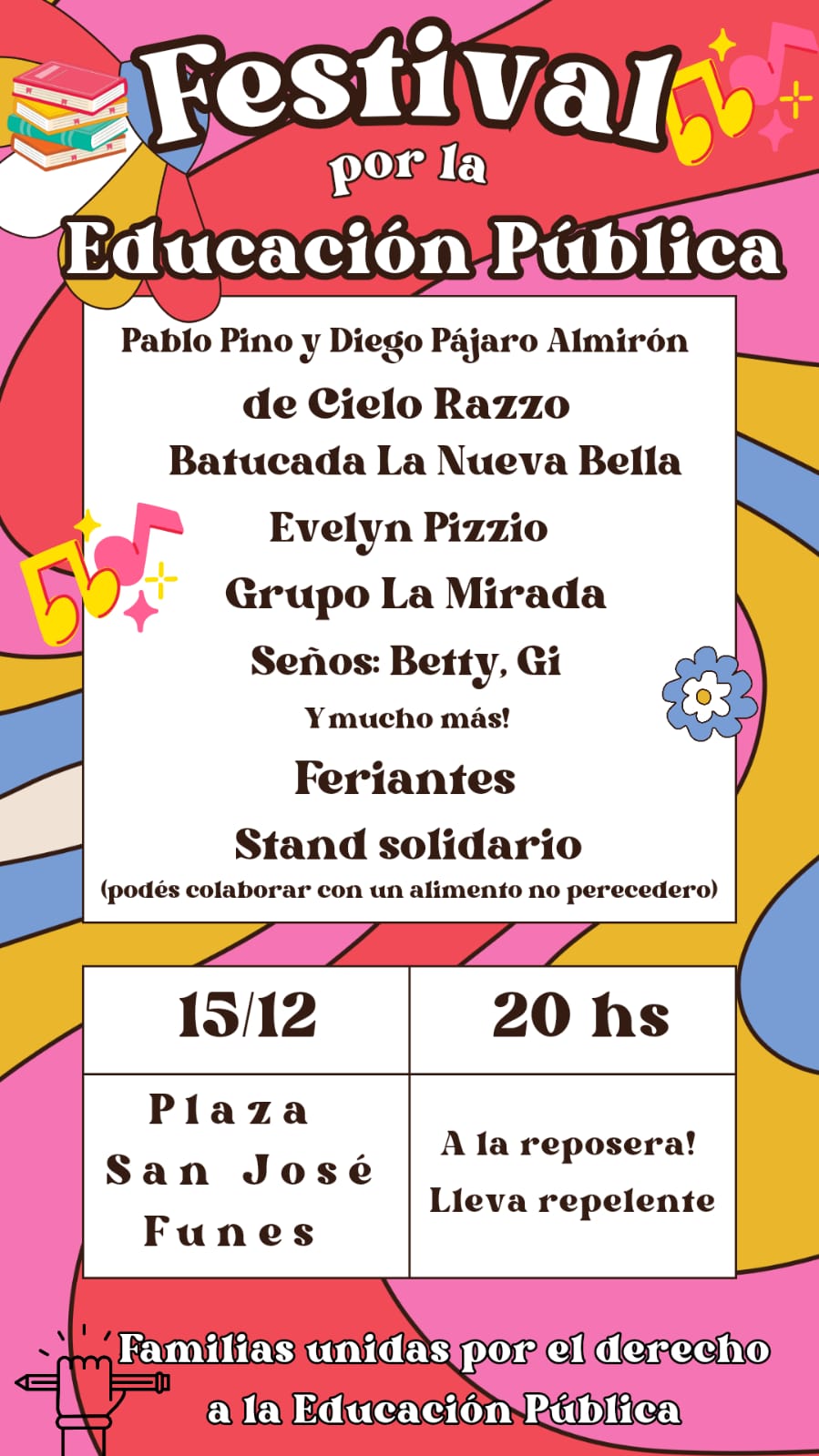 El festival se llevará a cabo el viernes 15, desde las 20, en la Plaza San José, donde habrá feriantes, un stand solidario que recibirá el o los alimentos no perecederos que lleve el público, actividades infantiles, batucada con la Nueva Bella, la música del DJ Droopy Faiola y las canciones de Evelyn Pizzio y de Pablo Pino y Diego Almirón, integrantes de la reconocida banda Cielo Razzo.