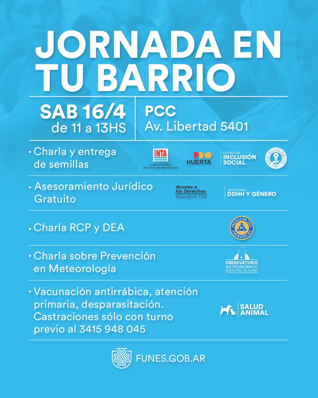 Desde el Gobierno de Funes organizaron para este sábado 16, entre las 11 y las 13 horas, una nueva edición de “Jornada en tu barrio”, con la participación de diferentes áreas del municipio que ofrecen sus servicios a todos los vecinos funenses. La actividad se realizará en Av. Libertad 5401, en el barrio Profesional Country Club de Garita 16.