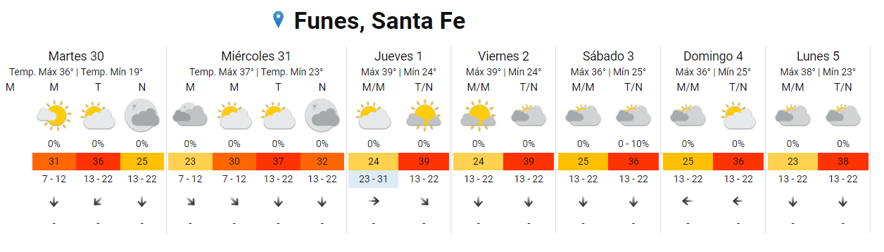 Al igual que en el resto de la provincia de Santa Fe, Funes está incluido en la alerta amarilla por calor que emitió el Servicio Meteorológico Nacional (SMN) . Por lo tanto, a partir de hoy, empiezan días con temperaturas muy altas en la ciudad.
